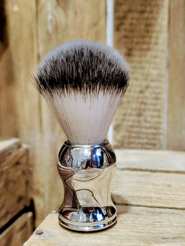 Manche en chrome poli et poils en nylon. Résistant à la rouille, facile à nettoyer. Matériaux ferme, souple et doux pour un toucher agréable. Évite les irritations de la peau. Contrairement aux poils naturels, le nylon est non poreux, ce qui évite la prolifération des bactéries.