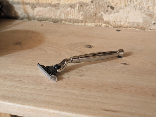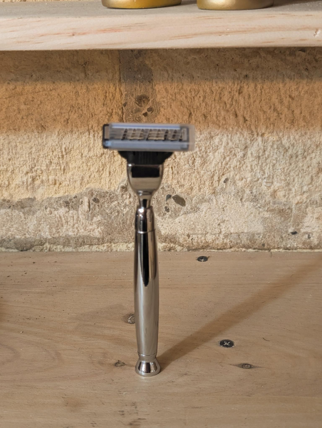 Le manche du rasoir est fabriqué en acier inoxydable, offrant une prise en main solide et équilibrée. La tête du rasoir est interchangeable compatible avec un model Gillette Mack 3.